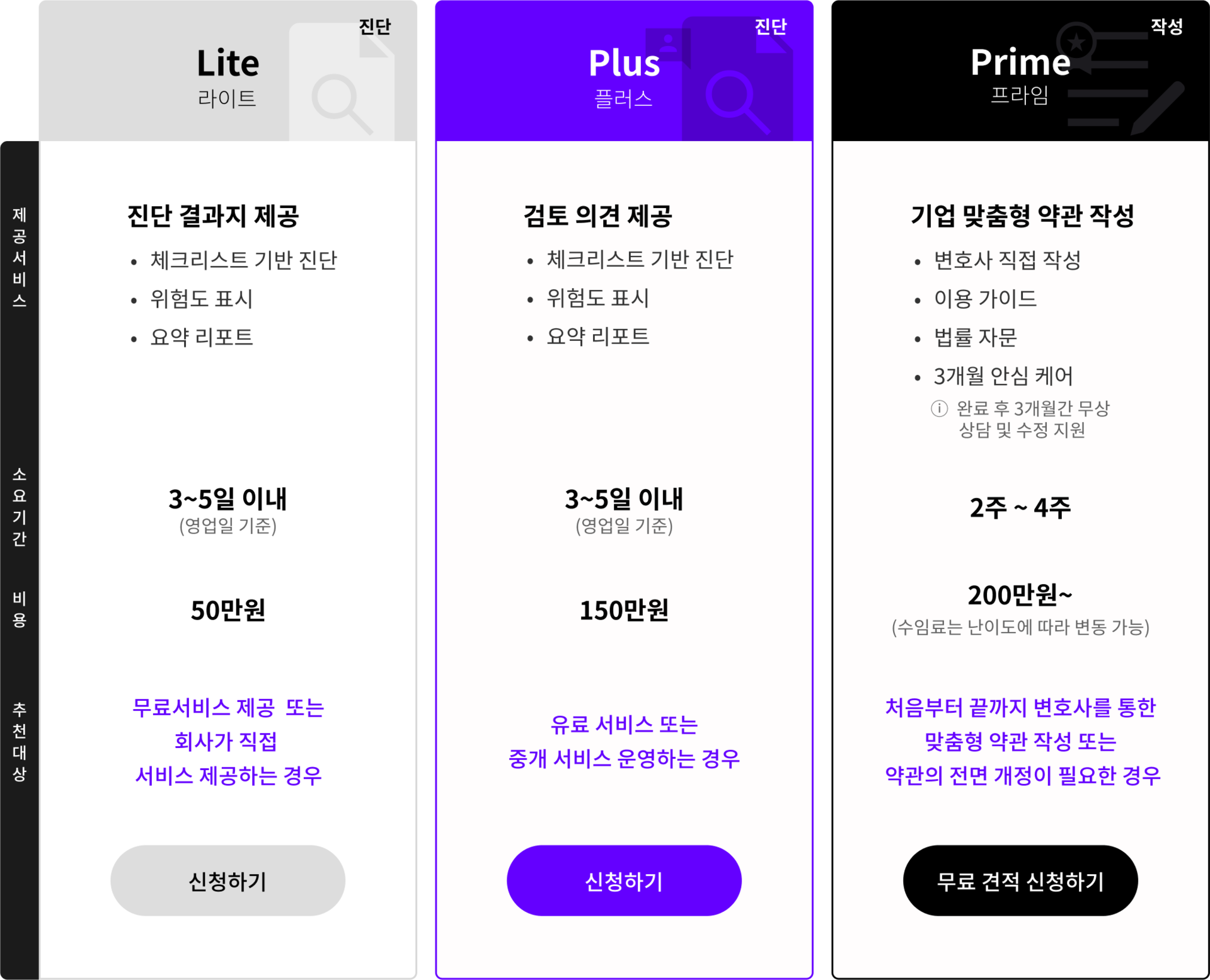 Prime(프라임) : 약관의 맞춤형 설계부터 작성, 운영 가이드와 사후 관리까지 완성도 높은 솔루션을 원하는 기업에 적합합니다. 처음부터 끝까지 변호사가 직접 작성, 자문하는 서비스이므로 맞춤형 약관의 작성을 원하는 경우 또는 신규 서비스 등의 추가로 약관의 전면 개정이 필요하고, 기존 약관과 조화롭게 보완하는 것이 필요한 기업에 권장합니다.